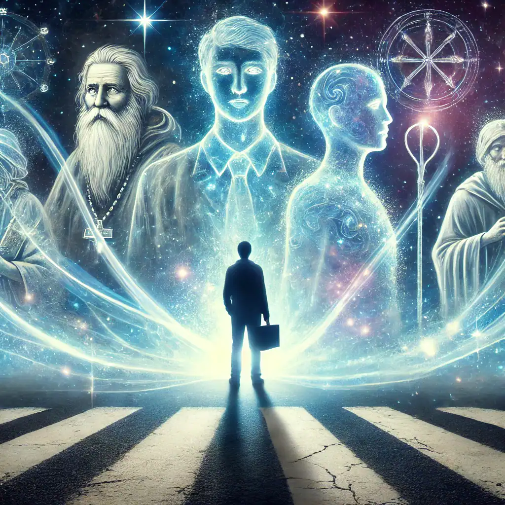 An artistic depiction of psychic medium Daksh surrounded by spirit guides, cosmic symbols, and celestial energy, emphasizing spiritual connection and insight.